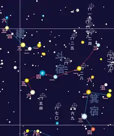 The Dipper mansion (斗宿, pinyin: Dǒu Xiù) is one of the Twenty-eight mansions of the Chinese constellations. It is one of the northern mansions of the Black Tortoise. In Taoism, it is known as the "Six Stars of the Southern Dipper" (南斗六星, Nándǒu liù xīng), in contrast to the Big Dipper north to this mansion.