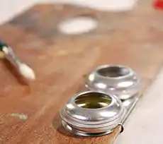 An oil dipper is used to hold a supply of turpentine, oil or painting medium, fastened to the painter's palette.[1]