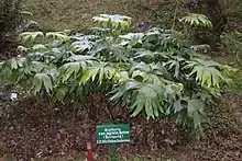 The mid green,[3] or dark green fronds,[1] but paler or glaucous underneath.[2] are between 0.5–0.7 m (1 ft 8 in – 2 ft 4 in) long and 0.5–0.7 m (1 ft 8 in – 2 ft 4 in) wide.[1][5][3] They are divided to the base into two spreading fan-shaped halves, which are further divided more than halfway into 4 or more unequal lobes, these lobes are again less deeply lobed once or more times. The ultimate lobes taper to a narrow apex with the edges deeply or coarsely toothed. The main veins are dichotomously branched several times.[6][1] The veins on the fronds are also dichotomously-branched with 2–4 main veins entering each of the lobes.[5][2] The juvenile fronds are tomentose (with a layer of downy hairs).[3]