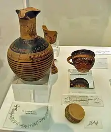 The text is written in an archaic form of the Greek alphabet, with some letter shapes still resembling those of the original Phoenician alphabet. For example, the Greek letter zeta (Ζ) resembles the Phoenician letter zayin (I). The text is written from right to left, with the individual letters mirror-shaped in comparison with the modern forms. It is placed in a circle around the shoulder of the vessel. The text consists of 46 characters, of which the first 35 can easily be read as a hexametric verse in Greek. The fragmentary rest is believed to have been the beginning of the second verse of a distichon , but the exact interpretation is unclear. B. Powell has argued that the final characters may represent a garbled snippet from the middle of an abecedarium (ΚΛΜΝ) by a second hand, someone learning to write.[1] More recently, N. M. Binek has shown that the last six markings can "be viewed not as letters or as attempts to inscribe letters, but rather as decorative elements fashioned by a second inscriber in accordance with the principles of Geometric idiom," inasmuch as the segment roughly mirrors the shapes of letters 9-4 (ΧΡΟΝΥΝ).[2] The text marks the vessel as a prize in a dancing competition. It is translated as: "whoever of the dancers now dances most lightly ...", and the second line is conjectured to have said something to the effect of "... he shall get this (vessel as his prize)."