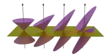 In quantum mechanics, Dirac cones are a kind of crossing-point which electrons avoid,[4] where the energy of the valence and conduction bands are not equal anywhere in two dimensional lattice k-space, except at the zero dimensional Dirac points. As a result of the cones, electrical conduction can be described by the movement of charge carriers which are massless fermions, a situation which is handled theoretically by the relativistic Dirac equation.[5] The massless fermions lead to various quantum Hall effects, magnetoelectric effects in topological materials, and ultra high carrier mobility.[6][7] Dirac cones were observed in 2008-2009, using angle-resolved photoemission spectroscopy (ARPES) on the potassium-graphite intercalation compound KC8.[8] and on several bismuth-based alloys.[9][10][7]