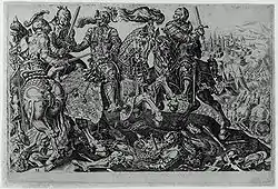 Coornhert was the youngest son of Volckert Coornhert, an Amsterdam cloth merchant. As a child he spent some years in Spain and Portugal. Returning home, he was disinherited by his father's will in 1539, for his marriage with Cornelia (Neeltje) Simons, a portionless gentlewoman[1] from Haarlem, whose sister was Anna Simonsdr, the mistress of Reginald (Reinoud), count of Brederode (they were the parents of Lucretia van Brederode). He was only seventeen and she was twelve years older. Through his sister-in-law, he became major-domo to Reginald at his castle in Vianen for a short time. Soon after that, in 1541, he bought a house in his wife's home town of Haarlem on the St. Janssteeg from Anna and her husband Jan. Though he started off working for Reginald, he lived near the school where the St. Jan commanderij taught classic works and commissioned art. Maarten van Heemskerck had just returned from Italy and impressed Coornhert with his work. Coornhert became an engraver on copper, and produced works in collaboration with Heemskerck which became popular.[3]