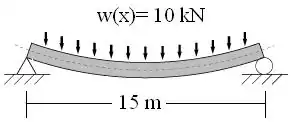 Simply supported beam with a constant 10 kN per meter load over a 15m length.