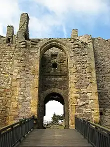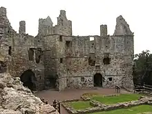 The gatehouse, kitchens, and east range were built by the Haliburtons in the 14th and 15th centuries. The gatehouse, built in the 14th century to the east of the keep, is similar to the one at nearby Tantallon Castle.[8] It is fronted by a high, pointed arch, formerly with bartizans, small round turrets, at the top. The gate was protected by a drawbridge over the outer ditch, a portcullis, and three sets of doors. Guard rooms open off the entrance passage, and a round opening in the roof, known as a "murder hole", allowed defenders to drop objects on to any attacker who breached the outer gate.[30]