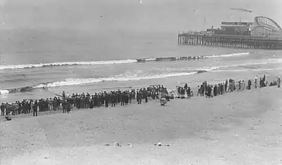 McPherson was scheduled to hold a service that day; her mother Minnie Kennedy preached the sermon instead, saying at the end, "Sister is with Jesus," sending parishioners into a tearful frenzy. Mourners crowded Venice Beach and the commotion sparked days-long media coverage fueled in part by William Randolph Hearst's Los Angeles Examiner and a stirring poem by Upton Sinclair. Daily updates appeared in newspapers across the country and parishioners held day-and-night seaside vigils. Two people died searching for McPherson's body.