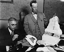 In December, Ormiston was found by newsmen, living quietly in Harrisburg, Pennsylvania. Papers described him being taken without resistance by police while sitting at a typewriter.[121] A Harrisburg detective characterized the affair as a "publicity stunt," but declined to elaborate. Among Ormiston's personal effects were five diplomas from five radio schools and letters implying he had a wife in Brazil.[101] He was escorted to Chicago, Illinois with intent to be transported to Los Angeles. Asa Keyes said he would “do everything in his power” to extradite Ormiston. However, he did not stop in Chicago to pick him up though he traveled near there on his way to and from Washington, D.C. The Chicago police chief denounced Keyes for "yelling to high heaven for his apprehension" but when the fugitive Ormiston was "within reach," Keyes called Ormiston of minimal importance.[103][122] The Chicago police chief lacked proper documents for further action, and to the annoyance of Los Angeles officials, Ormiston was released. When the warrant was finally obtained, Chicago police were ready to transport their expected prisoner, Ormiston, to Los Angeles [123] In the meantime, Ormiston appeared in Los Angeles surrounded by newsmen and was greeted by the entire prosecution staff. Affably, amidst the flashbulbs of photographers, Ormiston accepted his served warrant. His bond was set at $2,500.[124]