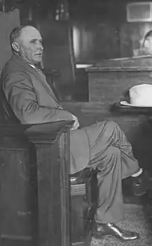 In the Douglas hospital, as he helped to question the convalescing evangelist, Assistant Deputy District Attorney Joseph Ryan enthusiastically professed his faith in McPherson's story. He even said he could make the desert trip without scuffing or marking his commissary shoes.[146][147] Later, however, in Los Angeles, Ryan testified that he knew that McPherson was a "fake and a hypocrite" the first time he saw her in the hospital.[148] Ryan was assistant to District Attorney Asa Keyes, and did much of the legwork in building the case against McPherson. The defense contended that both Ryan and his father-in-law, Captain Herman Cline, neglected their duty by disregarding evidence unearthed by border authorities that substantiated McPherson's version of her re-appearance.[149] The declaration by W. A. Gabrielson, chief of police of Monterey, said that "Mr. Ryan's conduct of this case was most unethical", referring to the methods Ryan used, among them entering the cottage in Carmel-by-the-Sea without a warrant, and without any local official present. Of particular interest among the seized pieces of evidence was a medicine bottle, because it was dated May 25, 1926, within the timeframe Ormiston and "Miss X" occupied the cottage. Again without warrant, demands were then made of the druggist and prescribing doctor about the medicine's user.[150] As it turned out, the bottle belonged to the landlord, H. C. Benedict, and contained a "commonplace preparation." Keyes thought that all the evidence obtained at Carmel-by-the-Sea was too vague for a successful prosecution for perjury and was ready to quit the case. Ryan met with Keyes and presented his "ace in the hole evidence" for continuance at Carmel-by-the-Sea. What Ryan offered was in the form of a receipt for a telegram said by him to be in McPherson's handwriting, signed by her at the Carmel cottage with two related witness identifications.[151]