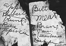 The Carmel cottage was further checked for fingerprints, but none belonging to McPherson were recovered. Two grocery slips found in the yard of the cottage were studied by a police handwriting expert and determined to be McPherson's penmanship. While the original slips later mysteriously disappeared from the courtroom, photostat copies were available.[84] The defense had a handwriting expert of their own and claimed to have a photograph of the well publicized slips which differed from the police photostat. They contended the reproduction "had been maliciously tampered with" to resemble McPherson's handwriting.[85] The slips' suspicious origin was also questioned. The original slips would have been in the yard for two months, surviving dew, fog, and lawn maintenance before their discovery by deputy DA Ryan.[86] Frustrated with his own witnesses and evidence, at the close of one of the day's sessions, prosecutor Keyes disgustedly threw a stool top after the departing courtroom crowd.[87]