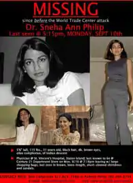 Sneha Anne Philip (October 7, 1969 – legal d. September 11, 2001) was an Indian-American physician who was last seen on September 10, 2001, by a department store surveillance camera near her Lower Manhattan apartment. She may have returned to the building at some point that night or the next morning. Due to the proximity of the World Trade Center and her medical training, Philip's family believes she perished trying to help victims of the following day's terrorist attacks.