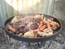 Discada is a mixed meat dish popular in the northern Mexican cuisine. The dish includes a mixture of grilled meats cooked on an agricultural plow disk harrow, hence its name. The basic meats for a traditional discada include beef (usually a flank cut), bacon, ham, sausage, and Mexican chorizo.[1] The disk is placed over an open flame, and the ingredients are introduced one at a time. The meats are seasoned and marinated according to the cook's preference and usually include salt, pepper, lime juice, and garlic. Aromatics including white or purple onions, bell peppers, Jalapeno or Serrano peppers, olives, and tomatoes are also used to add flavor and color to the dish. It is usually served with tortillas in tacos or separately on a plate.