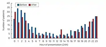 - Forster, S. Lesley; Smith, Myles; Fulde, Gordian WO (2 November 2015). "Presentations with alcohol-related serious injury to a major Sydney trauma hospital after 2014 changes to liquor laws". The Medical Journal of Australia. 203 (9): 366. doi:10.5694/mja15.00637. PMID 26510806. S2CID 25481774.
