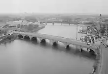 A concrete arch bridge was constructed from May 1918 to October 1921. The bridge was one of three significant riverfront structures reconstructed following the flood, along with a floodwall and the Town Street Bridge. All three were designed by Braun, Fleming and Knollman in a classical style, complimenting the Ohio Statehouse.[5] It was demolished in 1990, to be replaced with the current bridge.[7] The 1921 bridge was part of the Scioto River Bridge Group, listed on the Columbus Register of Historic Properties in 1983 and proposed as part of the Columbus Civic Center Historic District, nominated to the National Register of Historic Places in 1988.[8] The concrete arch bridge had seven spans of varying lengths and carried six lanes of traffic and two pedestrian sidewalks. Two of the traffic lanes were used for streetcar tracks. The bridge featured classical balustrade railings made of Indiana limestone.[5]