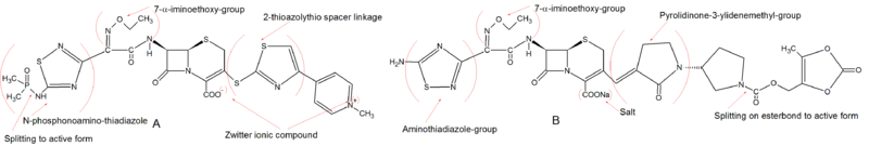 Currently there are only two drugs in this category, Ceftobiprole and Ceftaroline. These new drugs are also the only β-lactam antibiotics that are effective against methicillin-resistant-Staphylococcus-aureus (MRSA). Ceftobiprole is a pyrrolidinone-3-ylidenemethyl cephem. The C-3 side chain was specifically designed to have a strong binding affinity to PBP2a and PBP2x. PBP2a is known to give staphylococci resistance to other β-lactam drugs and PBPx does the same for pneumococci. Ceftobiprole also has an aminothiazoylhydroxyimino side chain at the C-7 position which is known to give good resistance to β-lactamase from S. aureus. Together these active groups make Ceftobiprole bactericidal to MRSA. Ceftobiprole has poor water solubility and is therefore administered intravenously as an ester prodrug called Ceftobiprole medocaril. It is rapidly broken down into active Ceftobiprole by plasma esterases.[27] Ceftaroline was developed from the fourth generation cephalosporin Cefozopran. It retains the alkoxyimino group at position C-7 from earlier generations so it is fairly stable in the presence of many β-lactamases. Since MRSA and penicillin resistant Streptococcus pneumoniae have resistance dedicated to new types of PBP, PBP2a and PBP2x respectively, both Ceftaroline and Ceftobiprole have C-3 side chains specially engineered to bind these new PBP. In the case of Ceftaroline this side chain contains a 2-thioazolythio spacer linkage optimised for its anti-MRSA activity. Ceftaroline has low water solubility but this problem was overcome by attaching a N-phosphonoamino group to the molecule making the intravenous prodrug Ceftaroline fosamil. The prodrug is dephosphorylated in plasma to form active Ceftaroline.[28]
