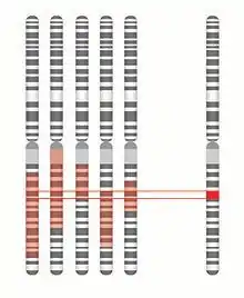 Identity by descent (IBD) mapping generally uses single nucleotide polymorphism (SNP) arrays to survey known polymorphic sites throughout the genome of affected individuals and their parents and/or siblings, both affected and unaffected. While these SNPs probably do not cause the disease, they provide valuable insight into the makeup of the genomes in question. A region of the genome is considered identical by descent if contiguous SNPs share the same genotype. When comparing an affected individual to his/her affected sibling, all identical regions are recorded (ex. Shaded in red in above figure). Given that an affected sibling and an unaffected sibling do not have the same disease phenotype, their DNA must by definition be different (barring the presence of a genetic or environmental modifier). Thus, the IBD mapping results can be further supplemented by removing any regions that are identical in both affected individuals and unaffected siblings.[3] This is then repeated for multiple families, thus generating a small, overlapping fragment, which theoretically contains the disease gene.