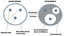 In diagnostic laboratories, the test is performed by inoculating the surface of an agar plate with bacteria isolated from a patient's infection. Antibiotic-containing paper disks are then applied to the agar and the plate is incubated. If an antibiotic stops the bacteria from growing or kills the bacteria, there will be an area around the disk where the bacteria have not grown enough to be visible. This is called a zone of inhibition. The susceptibility of the bacterial isolate to each antibiotic can then be semi-quantified by comparing the size of these zones of inhibition to databases of information on known antibiotic-susceptible, moderately susceptible and resistant bacteria. In this way, it is possible to identify the most appropriate antibiotic for treating a patient's infection.[1][2] Although the disk diffusion test cannot be used to differentiate bacteriostatic and bactericidal activity, it is less cumbersome than other susceptibility test methods such as broth dilution.[4]