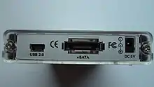 These may also be referred to as a caddy – a sheath, typically plastic or metallic, within which a hard disk drive can be placed and connected with the same type of adapters as a conventional motherboard and power supply would use. The exterior of the caddy typically has two female sockets, used for data transfer and power.