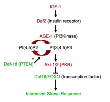 Much research has been done on the antagonistic effects of increased growth on lifespan. Specifically, the hormone insulin-like growth factor 1 (IGF-1), binds to a cell receptor, leading to a phosphorylation cascade. This cascade results in kinases phosphorylating forkhead transcription factor (FOXO), deactivating it. Deactivation of FOXO results in an inability to express genes involved in responding to oxidative stress response, such as antioxidants, chaperones, and heat-shock proteins.[6] Additionally, uptake of IGF-1 stimulates the mTOR pathway, which activates protein synthesis (and therefore growth) through upregulation of the translation-promoting S6K1, and also inhibits autophagy, a process necessary for recycling of damaged cellular products.[7] Decline of autophagy causes neurodegeneration, protein aggregation and premature aging.[8] Lastly, studies have also indicated that the mTOR pathway also alters immune responses and stimulates cyclin-dependent kinase (CDK) inhibitors such as p16 and p21. This leads to alteration of the stem-cell niche and results in stem cell exhaustion, another theorized mechanism of aging.[9]