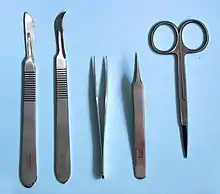 Dissection tools. Left to right: scalpels with No. 20 and No. 12 blades, two forceps and scissors