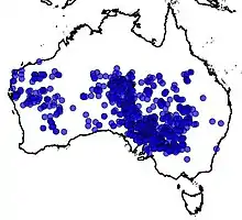 The species occurs in many woodland communities including mallee, mulga, bimble box, belah-rosewood and gidgee communities, as well as bladder saltbush and black bluebush communities.[2] Preferred habitat is red earth and solonized (high saline content) brown soils.[2] Species of the family Chenopodiaceae have adapted to and are tolerant of highly alkaline soils, that contain high levels of carbonates and salts, whilst still being able to produce many seeds.[5] Plants are short lived, and although specimens may be locally common, seasonal conditions can determine relative abundance of Dissocarpus paradoxus.[2] Although stock do forage on Dissocarpus paradoxus, it is not as palatable as other forage plants.[2]