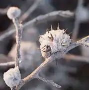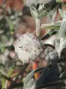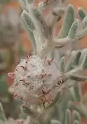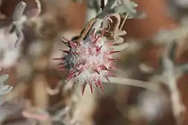 Common names for Dissocarpus paradoxus include Cannon Ball Burr, Ball Bindyi, Curious Saltbush and Hard-head Bassia.[3] The species was described and named (synonymous with Bassia paradoxa) by Robert Brown & Baron Ferdinand von Mueller.[2] Dissocarpus paradoxus is a short lived perennial shrub growing to 50 cm high, with hairy leaves to 15mm long.[4] The species has also been described as an annual or short-lived perennial forb or shrub, and sometimes growth is described as prostrate.[3] The flowers consist of white woolly heads, with 8-16 flowers clustered together at the base of leaves.[3] Flowering occurs from early spring through to summer, however flowering can sometimes occur at other times throughout the year.[2] Fruit is globular, dense and a hardened mass of white woolly texture, around 10mm in diameter, with many ridged spines extending out of the woolly mass.[2] As the hardened woody head decomposes, the seeds are released.[4] Dissocarpus paradoxus Var. latifolia differs slightly from paradoxus, with oblong to wedged shaped leaves, which are 5-8mm wide.[2]