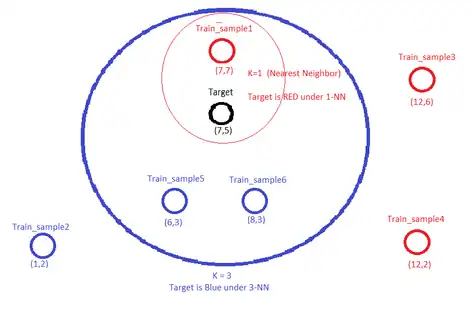 This classification focused model predicts the label of the target based on the distance matrix between the target and each of the training samples to determine the K-number of sample that are the closest/nearest to the target.