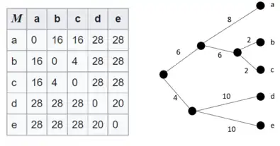 For this case, M is called an additive matrix and T is called an additive tree. Below we can see an example of an additive distance matrix and its corresponding tree: