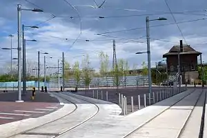 Running on a separated right-of-way, the branch line is approximately 700 metres (0.43 mi) long and has three stops, each with a platform.[1][5] Both streetcar tracks run on the east side of the street, with a tree-lined median separating them from two automobile lanes, and bike lanes on either side of them. The entire width is 32.5 metres (107 ft), including sidewalks 5 metres (16 ft) wide.[5][6]