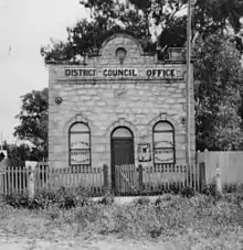 The township of Booyoolie was severed and annexed by the District Council of Yangya in 1879, and the broader southern portion of the council was added to the renamed District Council of Gladstone on 12 August 1880, in each case following representations from local residents.[4][1] Having already been substantially reduced in size by the Gladstone area changes, the district lost a significant portion of its remaining ratepayers when the township of Laura separated as the Corporate Town of Laura on 22 June 1882, leaving it representing a nearly entirely rural area.[1] As their office fell within the boundaries of the new Laura municipality, it was the subject of a dispute over its ownership; however, the Booyoolie council continued to meet at Laura. The Booyoolie council would operate out of a Herbert Street office for many years, but by the 1920s, the council offices were located in Hughes Street, opposite the Laura Courthouse.[5][6]
