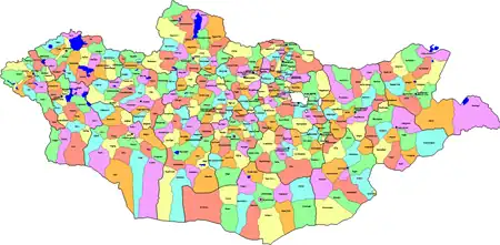 A district (Mongolian: сум, ᠰᠤᠮᠤ, sum, pronounced [sʰo̙m]; lit. "arrow"), is a second level administrative subdivision of Mongolia. The 21 Provinces of Mongolia are divided into 331 districts.[1]