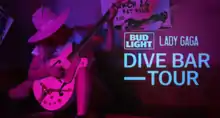 Gaga and Bud Light's collaboration was advertised with a number of TV spots, which included snippets of previously not heard tracks from the new album.[9][10] Prior the tour, it was reported that the audience would be made up of winners of an unknown contest, and all shows would be live streamed on Bud Light's Facebook page. The locations of the shows were kept a secret, and passes were given to the selected audience members only shortly before each show took place, to avoid large groups of people turning up, who wouldn't be able to fit into the small clubs.[5][11] The Dive Bar Tour visited three bars in Nashville, New York City and Los Angeles, on 5, 20 and 27 of October 2016, respectively.[12][13][14] According to People, hearing impaired people representing the group Not Impossible were invited to the first concert, in Nashville, who were introduced to a "groundbreaking technology" that included "a custom vest, wristbands and ankle bands that vibrated in time with the music." In addition, all songs were performed in sign language by famed interpreter Amber Gallego.[15]