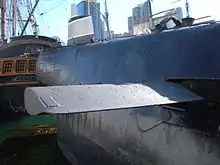 For easier berthing close alongside a jetty, submarines have used folding bow planes that retracted alongside the hull. Earlier submarines (to World War II) used vertical folding planes perpendicular to their surface. US submarines referred to this stowage as 'rigging' the planes, and 'tilting' for their control movement.[3] Later Soviet submarines have tended to fold backwards, into recesses in the casing.