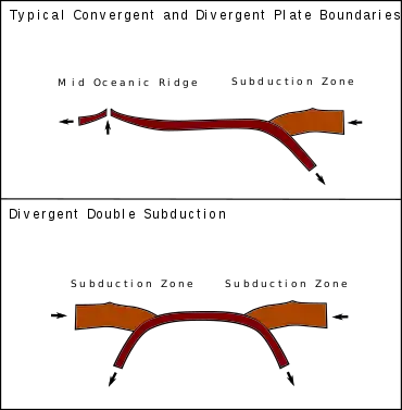 Divergent double subduction (abbreviated as DDS), also called outward dipping double-sided subduction,[1] is a special type of subduction process in which two parallel subduction zones with different directions are developed on the same oceanic plate.[2] In conventional plate tectonics theory, an oceanic plate subducts under another plate and new oceanic crust is generated somewhere else, commonly along the other side of the same plates[3] However, in divergent double subduction, the oceanic plate subducts on two sides. This results in the closure of ocean and arc–arc collision.