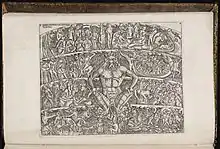 In addition, unlike similar works, Botticelli's manuscript uses but a single illustration per canto, which occupied a whole page, presenting a unified depiction of the sequence of events of a canto in a vertical format. This way, the readers know that when they advance to a new page, they enter the thematic sequence of a new canto.[25] The text of each canto, from left to right, matches, to a high degree,[25] the pictorial representation as the reader views the illustration from the upper left corner and then proceeds downwards. This reflects the vertical structure of the descent of the two poets through the nine circles of Hell. The additional two illustrations of the Map of Hell and Lucifer lie outside this canto-text structure, thus providing an element of continuity which unifies the work.[26] Lucifer's second drawing by Botticelli from Inferno XXXIV spans across two pages, and lies outside the text-illustration structure, unifying the narrative of the series. It also illustrates the full story of Inferno canto XXXIV and shows Lucifer's geographical position in Hell.[13]
