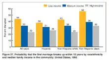 Studies have shown that men who "earn high incomes have a decreased probability of getting a divorce". However, higher income makes a woman's chances of marriage less likely and it has no connection to possible divorces.[53] In 1995, divorce rates have gone down due to education rates going up. This is because educated individuals make higher incomes in most cases, which result in less financial stress when couples set down to get married.[54] Lower income couples value and respect marriage just as much as higher income couples, however lower income couples are more likely to get a divorce because of financial strains on their marriage.[55] Having low income is not the only factor that can potentially lead to divorce. Religious beliefs, morals and compatibility all come into play when it comes to long term marital statuses.[56]