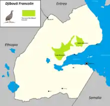 The Djibouti spurfowl is endemic to Djibouti, a nation in eastern Africa, and is known from only two locations. One is the Forêt du Day in the Goda Mountains, approximately 25 km (16 mi) north of the Gulf of Tadjoura.[19] This site is only 15 km2 (3,700 acres) and is undergoing habitat changes.[4] The other site is located in the Mabla Mountains, which are 80 km (50 mi) northeast of the Forêt du Day and remain unsurveyed.[19][4] This site has been exposed to more human disturbance than the Forêt du Day, and is therefore considered less viable.[2] Combined, the total estimated range of this bird is 58 km2 (14,000 acres).[15]