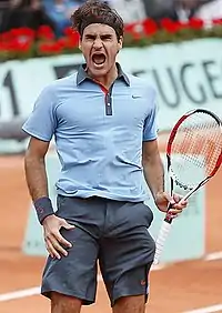 The pair have had two meetings at Roland Garros thus far, with both occurring at the semifinal stage. The first was at the 2011 French Open. Djokovic entered the tournament with a 43-match winning streak and was the sensation of the season. In the match, Federer won the opening set in a tiebreak and then claimed the second set to gain a substantial lead. Djokovic took the third set and was serving for the fourth set, but Federer came back to win it in a tiebreak closing out the match in four sets. The win ended Djokovic's winning streak as well as his 41–0 start to the 2011 season.[13] As a result, Federer advanced to his fifth French Open final where he lost to Nadal, for the fourth time in the final and fifth time overall.[14][15] Federer's win also saved John McEnroe's record of 42 consecutive match wins to start the 1984 season.[16] The victory further elevated Federer's head-to-head record against Djokovic to 14–9 and 3–1 on clay.[17]