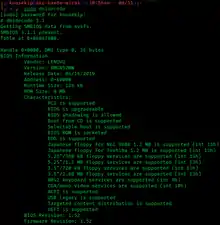 dmidecode is a free userspace command-line utility for Linux that can parse the SMBIOS data.[1][2] The name dmidecode is derived from Desktop Management Interface, a related standard with which dmidecode originally interfaced. SMBIOS was originally named DMIBIOS. The Linux kernel and other modern operating systems such as the BSD family contain an SMBIOS decoder, allowing systems administrators to inspect system hardware configuration and to enable or disable certain workarounds for problems with specific systems, based on the provided SMBIOS information. Information provided by this utility typically includes the system manufacturer, model name, serial number, BIOS version and asset tag, as well other details of varying level of interest and reliability, depending on the system manufacturer. The information often includes usage status for the CPU sockets, expansion slots (including AGP, PCI and ISA) and memory module slots, and the list of I/O ports (including serial, parallel and USB).[3][4] Decoded DMI tables for various computer models are collected in a public GitHub repository.[5]