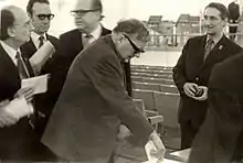 The restrictions on Shostakovich's music and living arrangements were eased in 1949, when Stalin decided that the Soviets needed to send artistic representatives to the Cultural and Scientific Congress for World Peace in New York City, and that Shostakovich should be among them. For Shostakovich, it was a humiliating experience, culminating in a New York press conference where he was expected to read a prepared speech. Nicolas Nabokov, who was present in the audience, witnessed Shostakovich starting to read "in a nervous and shaky voice" before he had to break off "and the speech was continued in English by a suave radio baritone".[72] Fully aware that Shostakovich was not free to speak his mind, Nabokov publicly asked him whether he supported the then recent denunciation of Stravinsky's music in the Soviet Union. A great admirer of Stravinsky who had been influenced by his music, Shostakovich had no alternative but to answer in the affirmative. Nabokov did not hesitate to write that this demonstrated that Shostakovich was "not a free man, but an obedient tool of his government."[73] Shostakovich never forgave Nabokov for this public humiliation.[74] That same year, he was obliged to compose the cantata Song of the Forests, which praised Stalin as the "great gardener".[75]