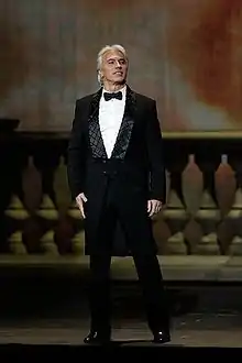 ![]() Dmitry Hvorostovsky singing an aria from The Queen of Spades during the reopening gala of the Bolshoi Theatre, 28 October 2011 | |