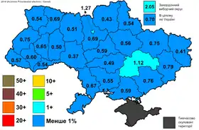 Yarosh was a candidate in the 25 May 2014 Ukrainian presidential election.[10] A poll conducted by the "Socis" research center (from 25 February – 4 March 2014) predicted that Yarosh's candidacy received the support of 1.6% of the people who were surveyed.[26] On election day he actually received 0.7% of the votes.[10] In January 2019 Yarosh stated he only took part in the election "not to destroy the revolutionary structures after the revolution".[27] He also stated that he was fully aware it was "virtually impossible" he could win the election and that because he was engaged in military action since the first days of April 2014 he did not campaign.[27]
