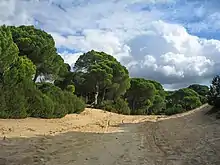 The ecosystem of the mobile dunes, also known as transdunes, which are formed by the prevailing south-west wind, is almost nonexistent elsewhere in the Iberian Peninsula. The harshness of this ecosystem is evident in the adaptations made by some plant species to its special conditions: the dunes of sand and soil are inconsistent. The gradual burial of vegetation, especially of trees that emerge then die, killed by the slow movement of sand, is one of the most well-known phenomena in the beach area of the park.