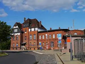 The Halle-Sorau-Guben Railway Company (Halle-Sorau-Gubener Eisenbahn, HSGE) opened the Cottbus–Falkenberg/Elster section of the Halle–Cottbus railway on 1 December 1871. The town's original station building in the town, which was called Dobrilugk-Kirchhain, is now called the Alter Bahnhof (old station). It was used until the late 20th century as a residential building and Bahnmeisterei[4] (the premises of the supervisor of track maintenance).