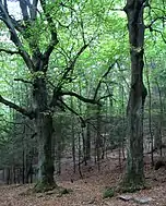 During the Second World War, an MVAC post was located at St. Ulrich's Church above Dobrunje. MVAC forces allegedly killed 123 people at the site,[5] using the rectory basement to torture their victims.[19] Soon after the war, reports about murders at St. Ulrich's started to appear in leftist emigrant newspapers such as Enakopravnost,[20] with some claiming that over 700,[21] 1,000,[22] or even 1,500[23] people had been killed there. Local people were forced to disinter bodies for three weeks and bury them in a mass grave.[24] A memorial by the architect Boris Kobe and the sculptors Karel Putrih (1910–1959) and Zdenko Kalin (1911–1990) was designed between 1948 and 1951, and was installed at the site in 1955.[25] The mass grave memorial officially contains the remains of 123 victims of the MVAC forces, 36 members of the fourth battalion of the Partisan Cankar Brigade killed in an attack on 18 September 1943, and the poet, playwright, and Partisan soldier Jože Moškrič (1902–1943).[5] The memorial complex also includes two beech trees in the forest south of the church where it is alleged that victims were shot.[25]