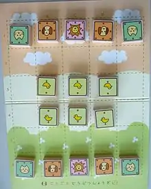 The pieces are square, like children's blocks, have cartoon figures of the relevant animal rather than kanji to identify them, and often have dots on the sides and corners of the directions the pieces can move. The game has been marketed overseas as "Let's Catch the Lion!"