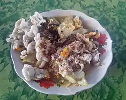 Docang or Doclang is a traditional food from Cirebon, a port town in West Java, Indonesia. It is made of sliced of rice cake, cassava leaves, sprouts, and krupuk, served in thick vegetable sauce called dage, which is made of mashed tempeh mixed with grated coconut.[1] This food has a distinctive savoury flavor and usually served warm for breakfast and it is sold in relatively affordable price. Today, authentic docang is rarely found even in Cirebon.[2]