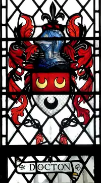 Docton is an historic estate in the parish of Hartland in Devon. The former "mansion house"[3] situated 3 miles south-west of the village of Hartland was the residence of the Docton (originally de Docton) family from the 15th century. Today the estate having been split-up comprises separate holdings of Docton Farm,[4] a working farm which operates holiday-let cottages including Waterwheel Cottage, Old Granary Cottage and Old Millhouse Cottage. Docton Mill,[5] the estate's former corn mill, is now operated as award-winning tea-rooms with a garden open to the public. The arms of the Docton family were: Per fess gules and argent, two crescents in chief or another in base sable.[6] These may be seen, amongst other places, in a 1933 stained glass window in St Nectan's Church, Hartland, by Townshend and Howson and on the ledger stone to Phillipa Cary (1603-1633) in Clovelly Church.