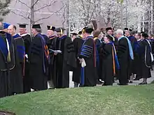 American academic doctors gather before the commencement exercises at Brigham Young University (April 2008). The American code for academic dress identifies academic doctors with three bands of velvet on the sleeve of the doctoral gown.