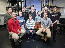 Other Dodd-Walls Centre research involves fundamental experimental and theoretical studies of ultra-cold quantum gases, including cold, controlled collisions and cold quantum chemistry. Quantum fluids such as Bose–Einstein condensates are configured to emulate the physics of other less accessible or controllable quantum systems.[61][62][14] This allows for direct investigation of condensed matter and many-body phenomena whose fundamental understanding remains obscure.[14] Niels Kjærgaard and his group have developed a novel particle collider to perform high precision atomic physics measurements.[63] They use optical tweezers to capture and collide small clouds of ultra-cold atoms to observe the quantum dynamics of low speed collisions.[64][65][66] Maarten Hoogerland's experiments with ultra-cold helium atoms have led to very precise measurements of the size, colour absorption and energy difference between quantum states of the helium atoms. They have also provided tests for the standard model of particle physics.[67][68][69] Theorist Ashton Bradley has advanced understanding of quantum and classical turbulence and vortices.[70][71][72] Theorists Blair Blakie and Danny Baillie correctly predicted the formation of stable droplets of ultra-cold gas.[73][74][75][76][77]