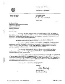 Justice Ruth Bader Ginsburg, a Justice of the Supreme Court of the United States, acted as a single Circuit Justice for this case. She ruled against vacating the stay imposed by the Court of Appeals of the Second Circuit upon the Federal District Court’s preliminary injunction.[5][6][7] Ginsburg said that the Court should hesitate to interfere with an appeals court that was proceeding on an expedited schedule to review a ruling against a federal law, and that, in any event, the Court should be cautious when such a law had been nullified in a lower court.[8] Nearly a year later, the government dropped its demands and allowed the release of the NSL. The ACLU and Library Connection hailed the government’s withdrawal as a victory for all library users who valued their privacy.[9] The case was dismissed as moot.[10]