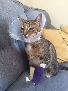 In order to prevent the animal from irritating a wound or removing stitches while self grooming, Elizabethan collars are used to either prevent the animal from licking/biting its wound or using its limbs to scratch their head, eyes, or ears. The collar can also be used to restrain animals with self-destructive habits, either from poor training or mental illness.[4]